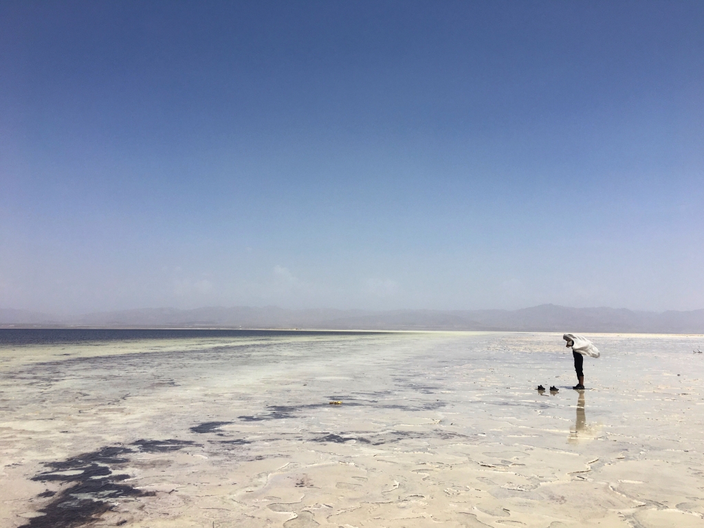Essayez d’imaginer maintenant, qu’au milieu du désert il y a un lac. Salé donc. L’eau frôle les 40°C. N’étant pas profond, on peut se prendre pour Moïse en le traversant à pied.
